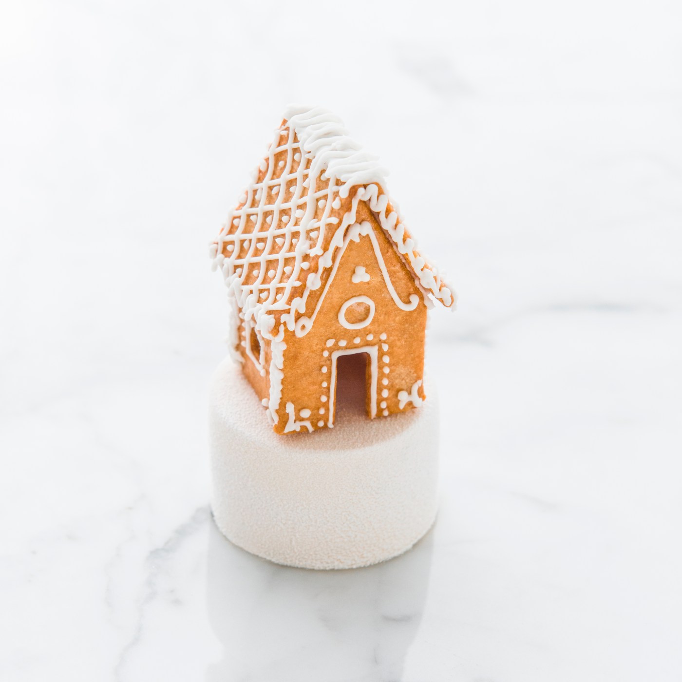 Dressare la mousse negli stampi, fino a ¾ della loro altezza e inserire le semisfere di cake alle mandorle, lisciando bene la base; far congelare in freezer. Smodellare le monoporzioni, spruzzarle con lo spray velluto e lasciare in frigorifero un’ora. Posizionare una casetta su ogni monoporzione e servire.