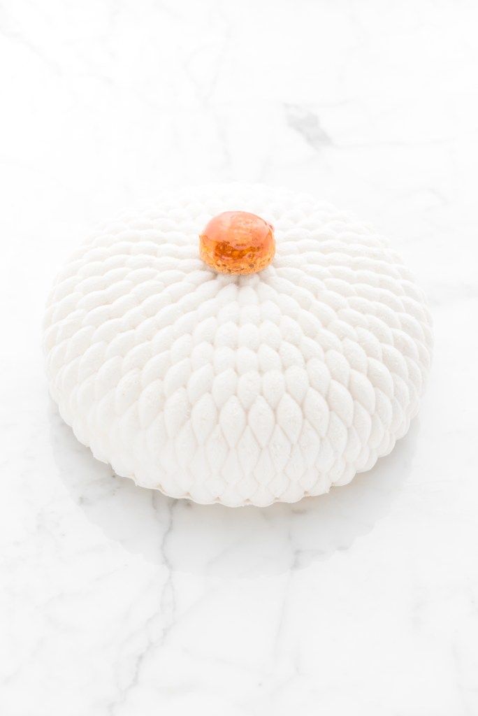 Cake alle mandorle Inserto di marmellata di mandarini Mousse al torrone Spray velluto Bignè craquelin caramellato Stampo Honoré @silikomart