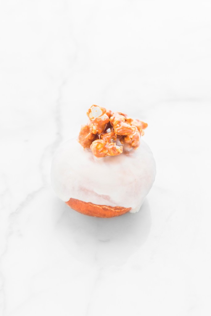 Per la glassa, fondere il burro e farlo cuocere a fuoco basso fino a che non assumerà un color nocciola; togliere dal fuoco, filtrare ed unire il latte. Mescolare bene, aggiungere lo zucchero a velo e mescolare bene, aggiungendo poco latte se la glassa dovesse essere troppo densa. Glassare i bombolini e decorarli con i popcorn caramellati.