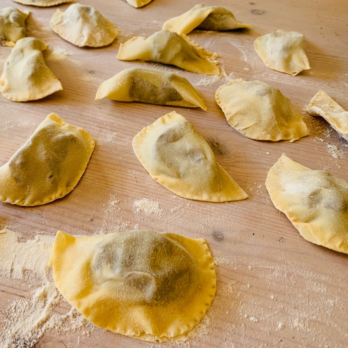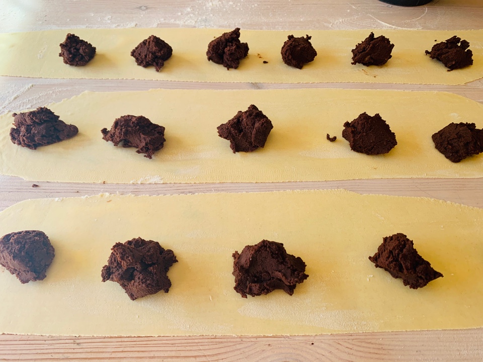 Con la macchinetta per la pasta tiro la sfoglia partendo dal livello più spesso fino a ripassarla al livello più sottile. Aiutandomi con un cucchiaino adagio delle noci di ripieno sulla sfoglia distanziate tra di loro circa 5 cm poi con un pennello bagno i bordi e ripiego la pasta sul ripieno.