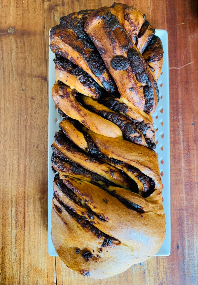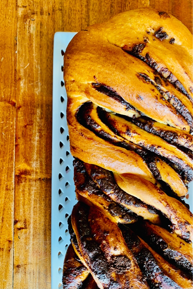 Lascio lievitare un’ora in frigo in una terrina coperto da pellicola. Poi riprendo l’impasto e lo stendo formando un rettangolo 50X40 cn. Stendo la crema al cioccolato preparata in precedenza e arrotolo la pasta dal lato più lungo. Divido in due il rotolo (perché con questa ricetta usciranno due Babka) ottendendo due rotoli da 25 cm circa. Taglio ogni cilindro nel senso della lunghezza ottenendo due mezzicilindri rigati bianchi e e neri. Intreccio i due mezzi cilindri tra loro e adagio in uno stampo da plumcake da 20/25 cm rivestito di carta forno. Faccio lo stesso procedimento per il secondo Babka e lascio lievitare entrambi coperti da un canovaccio, per circa 2 ore, in forno con la luce accesa.