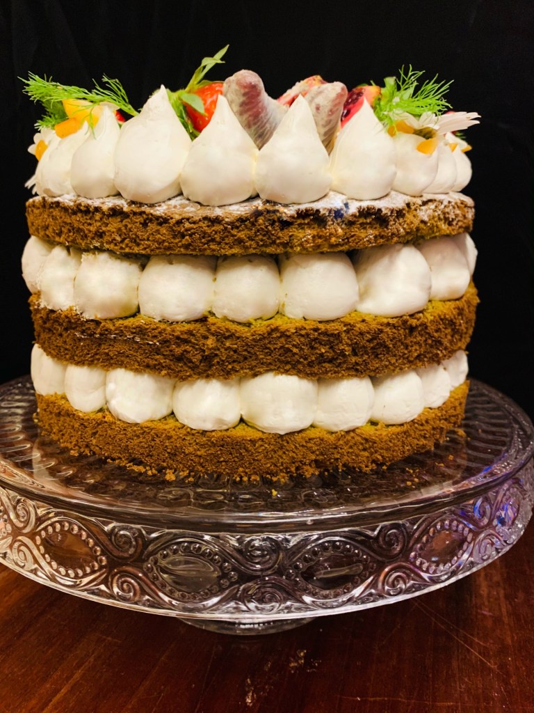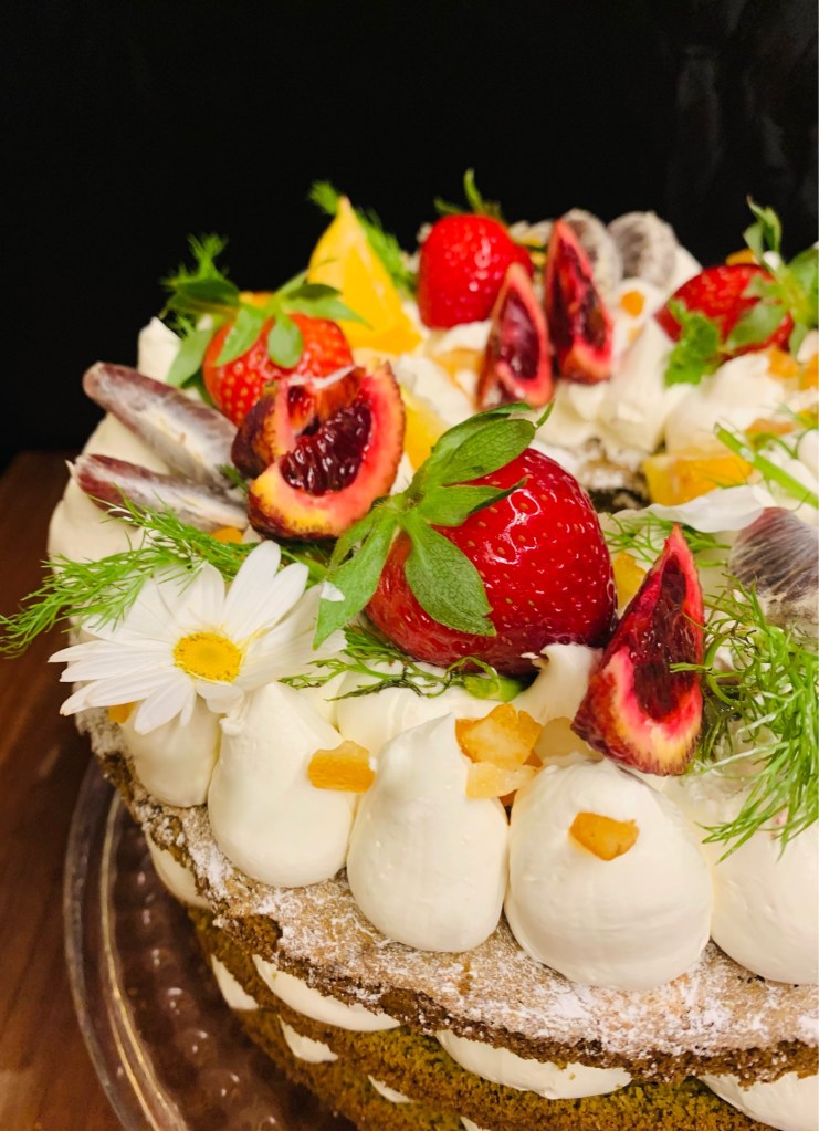 Taglio in senso orizzontale la ciambella al the’ matcha, bagno con la bagna agli agrumi. Con la sac a poche creo tanti ciuffi concentrici alti circa 3 cm e cospargo di canditi a cubetti piccoli. Poi metto in frigo per circa 20 min in modo da fare indurire i ciuffi e fargli mantenere la forma appoggiando il secondo strato di cake al the matcha. Ripeto l’operazione sulla parte alta della torta poi decoro con canditi, spicchi di agrumi freschi ed erbe fresche (rosmarino, maggiorana, timo, basilico o ciò che preferite).