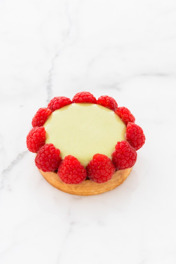 Riprendere la ganache montata congelata dal freezer, glassarla con il nappage neutro scaldato a 32° C e poi appoggiarla sulle tartellette. Lasciare in frigorifero a scongelare per un’ora e prima di servire decorare con i lamponi.