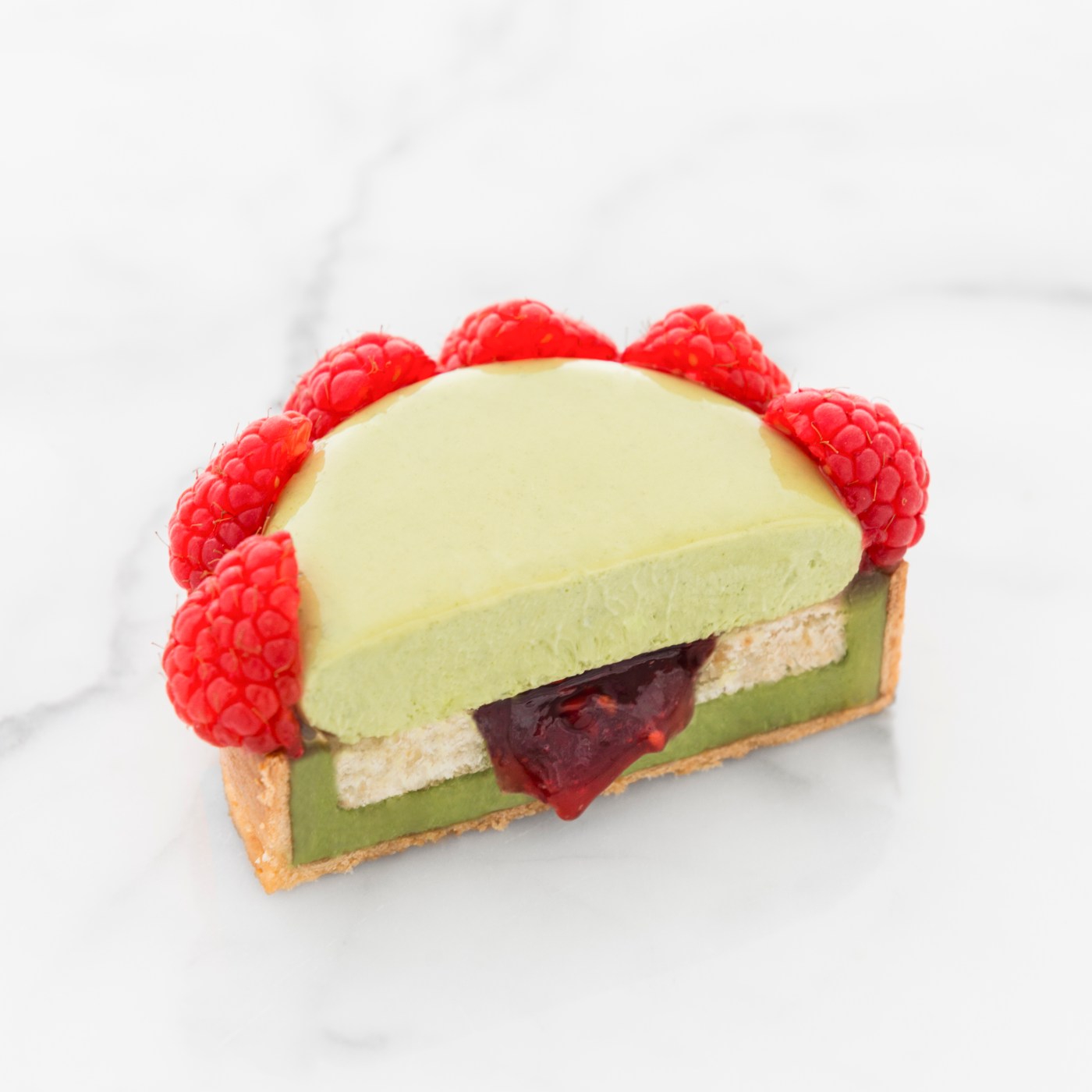 Ganache montata al tè matcha 65 + 180 g panna 55 g cioccolato bianco 1,7 g gelatina 200 bloom 9,8 g acqua 3,2 g tè matcha Composta di lamponi 105 g purea di lamponi 7,5 g zucchero semolato 15 g glucosio 1,3 g pectina Nappage neutro 6 g gelatina 200 bloom 250 g acqua 50 g glucosio 140 + 5 g zucchero semolato 2,5 g pectina NH (o 10 g fruttapec 1:1) 15 g succo di limone Decorazione Lamponi