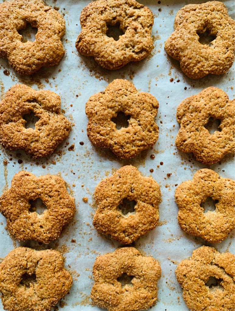 Nella planetaria inserisco tutti gli ingredienti ad eccezione delle uova e della farina. Emulsiono poi aggiungo uova e farina ed amalgamo bene. Ripongo a riposare in frigo per circa mezz’ora. Stendo poi una sfoglia spessa 5 mm tra due fogli di carta forno e passo in congelatore per 10 minuti.