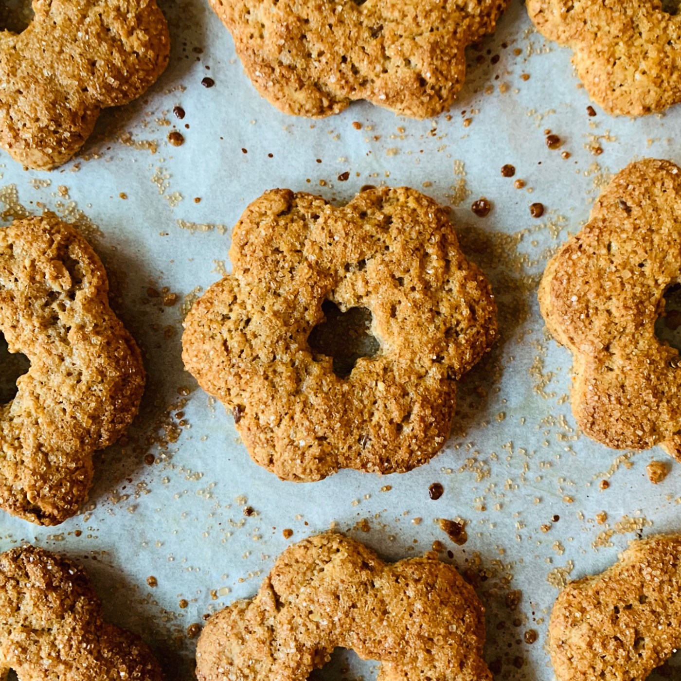 Nella planetaria inserisco tutti gli ingredienti ad eccezione delle uova e della farina. Emulsiono poi aggiungo uova e farina ed amalgamo bene. Ripongo a riposare in frigo per circa mezz’ora. Stendo poi una sfoglia spessa 5 mm tra due fogli di carta forno e passo in congelatore per 10 minuti.