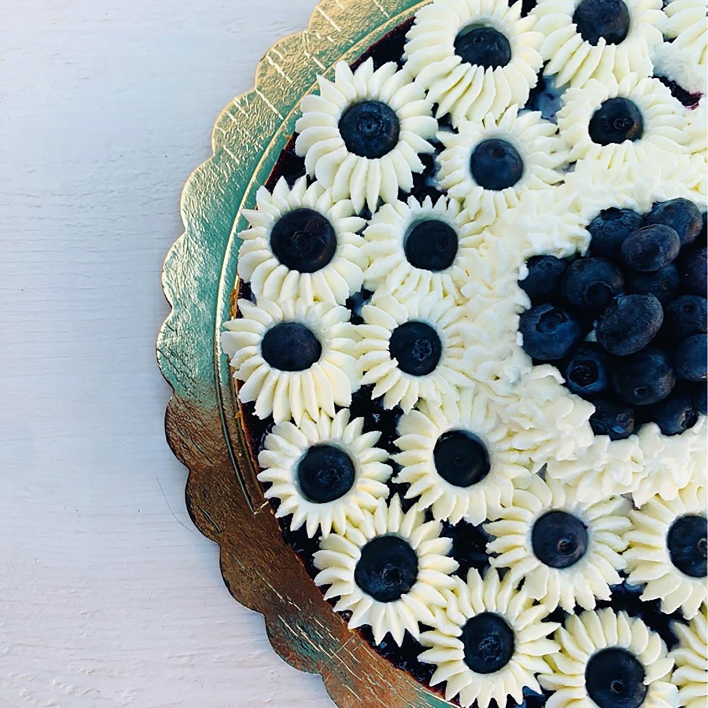 Una volta cotta la crostata con il frangipane aspetto che raffreddi poi stendo uno strato di confettura di mirtilli e realizzo tante corolle di fiori con la mousse di mascarpone aiutandomi con la sac a poche e la bocchetta Sultana. Inserisco un mirtillo fresco dentro ogni corolla.