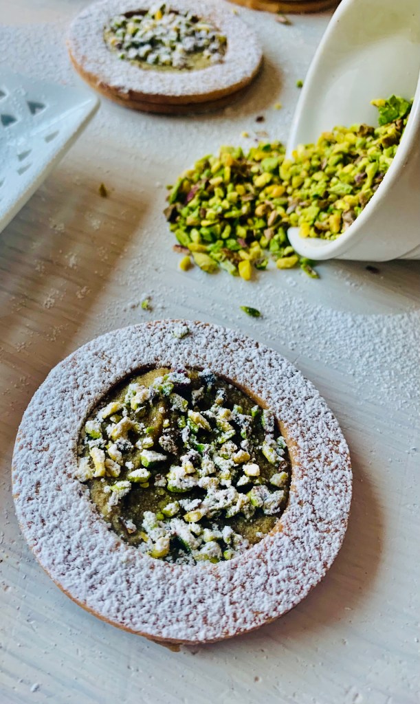 Poi, con un coppapasta del diametro di 4 cm bucate nella parte centrale la metà dei cerchi ottenuti in precedenza. Mettete tutte le parti dei biscotti separate su un tappetino microforato e cuocere in forno ventilato a 170° C per 12/14 minuti. Sfornate e lasciate raffreddare. Poi spalmate un lieve strato di crema al pistacchio su un cerchio e adagiateci il disco bucato facendo combaciare i due biscotti ed esercitando una leggerissima pressione. Spolverizzateli di zucchero a velo poi, con l’aiuto del sac a poche, riempite il foro centrale del biscotto di crema al pistacchio e cospargete con granella di pistacchi.
