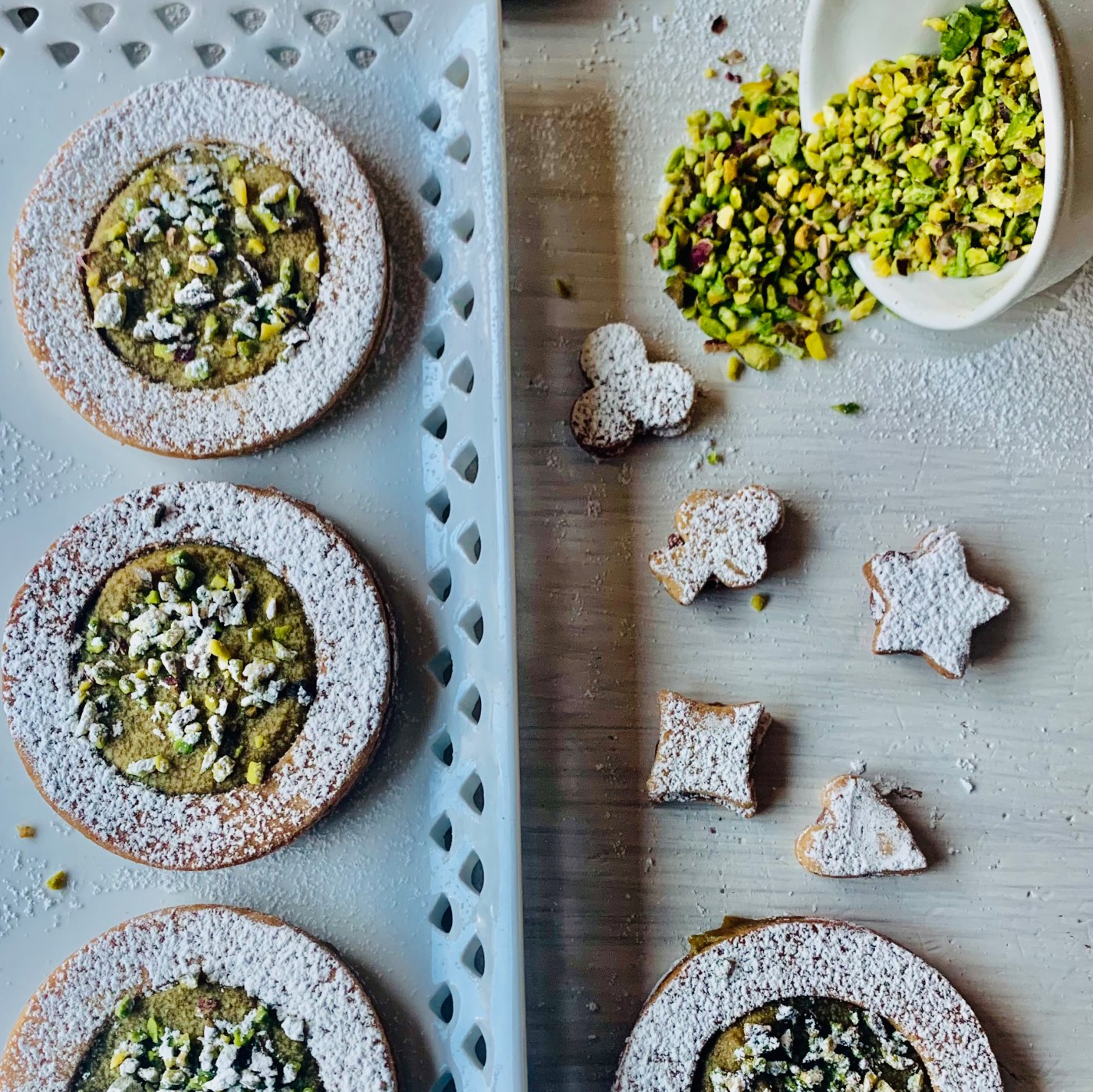 Poi, con un coppapasta del diametro di 4 cm bucate nella parte centrale la metà dei cerchi ottenuti in precedenza. Mettete tutte le parti dei biscotti separate su un tappetino microforato e cuocere in forno ventilato a 170° C per 12/14 minuti. Sfornate e lasciate raffreddare. Poi spalmate un lieve strato di crema al pistacchio su un cerchio e adagiateci il disco bucato facendo combaciare i due biscotti ed esercitando una leggerissima pressione. Spolverizzateli di zucchero a velo poi, con l’aiuto del sac a poche, riempite il foro centrale del biscotto di crema al pistacchio e cospargete con granella di pistacchi.