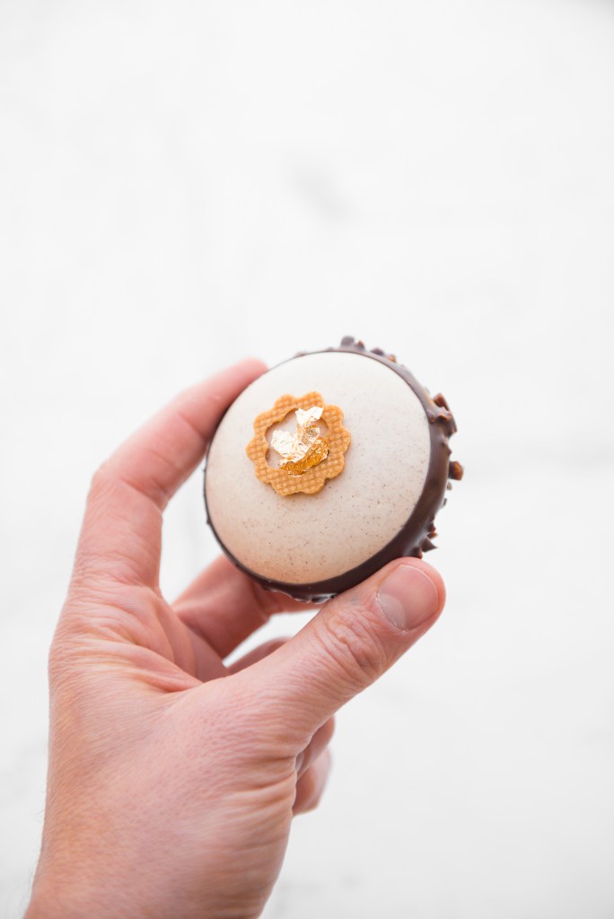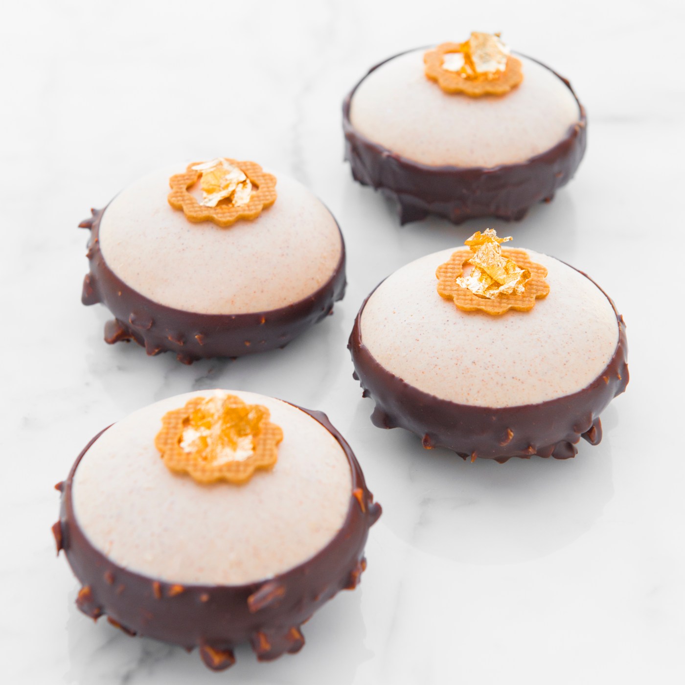 Smodellare e inserire in ogni mono porzione due stuzzicadenti, poi immergerle per metà nella glassa, appoggiandole poi su un foglio di carta da forno o un tappetino in silicone; lasciare in frigorifero per 3 ore, poi prima di servirle decorare con pâte sucrée e foglia oro.