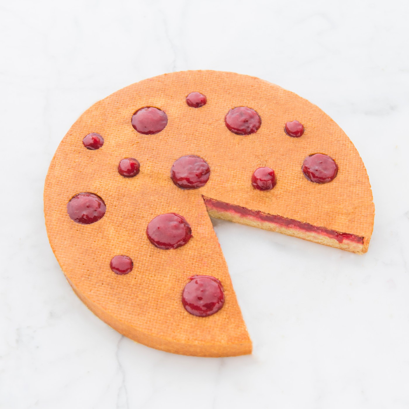 Rifilare il cake in modo che sia alto circa 5 mm meno dell’altezza dei bordi del guscio di sucrée e di diametro leggermente più piccolo, poi appoggiarlo su un piatto da portata. Dressare la composta sul cake, creando uno strato di circa 5 mm e appoggiare sopra il guscio di sucrée, premendo leggermente, coprendo il tutto. Con la composta avanzata riempire i fori sulla superficie.