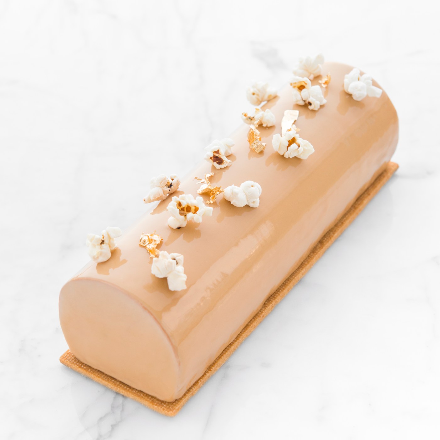 Mousse ai popcorn 350 g latte intero 60 g popcorn 105 g panna 45 g tuorli 16 g miele 4,7 g gelatina 200 bloom 100 g cioccolato fondente 50% 315 g panna Croustillant 30 g cioccolato fondente 50% 30 g pralinato di mandorle 15 g popcorn tritati 15 g gavottes (o sucrée cotta) Nappage neutro 6 g gelatina 200 bloom 250 g acqua 50 g glucosio 140 + 10 g zucchero semolato 2,5 g pectina NH 15 g succo di limone Glassa al caramello 360 g zucchero semolato 120 g sciroppo di glucosio 60 g nappage neutro 240 g panna 105 g acqua 75 g latte in polvere 10,7 g gelatina 200 bloom Decorazione Popcorn Foglia oro