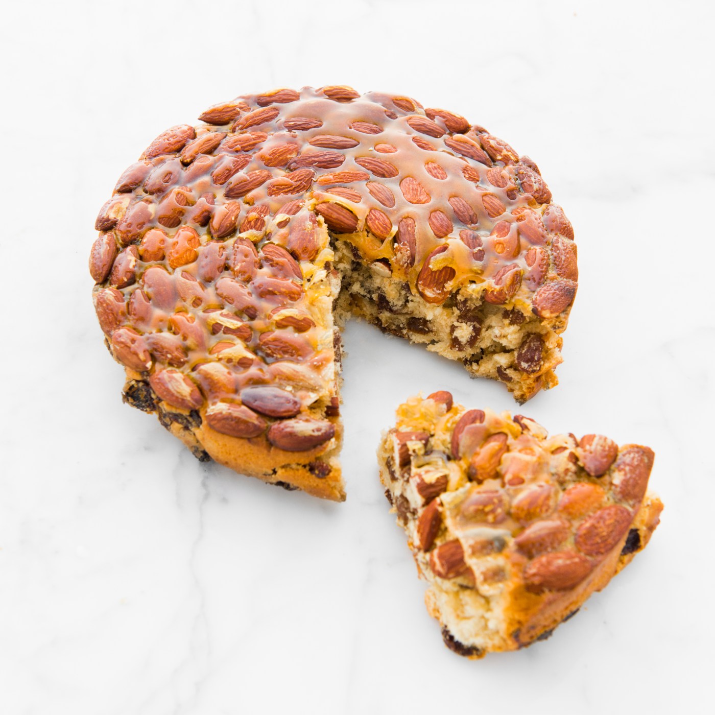 Attrezzatura Anello 20 cm di diametro, alto 5 cm Uvette macerate 210 g uvette 30 g acqua 110 g rum 55 g zucchero Impasto 75 g latte intero a temperatura ambiente 60 g uova a temperatura ambiente 195 g farina per lievitati 6 g lievito di birra 40 g zucchero semolato 3 g sale 90 g burro a temperatura ambiente Mandorle non spellate qb Opaline 100 g zucchero semolato 20 + 80 g sciroppo di glucosio 35 g acqua 0,8 g sale