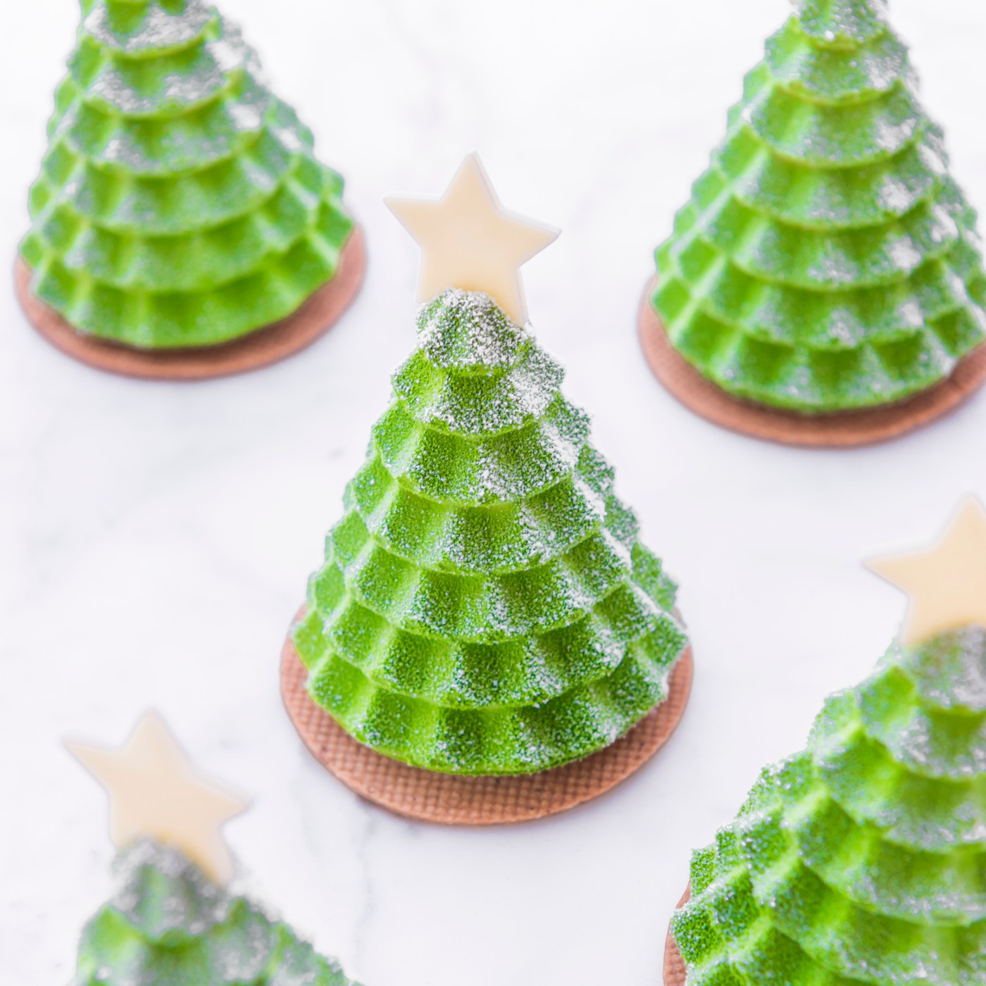 Pain d'epices 25 g miele di acacia 10 g zucchero di canna 15 g burro 25 g acqua 3 g mix di spezie per pan di zenzero 25 g farina 00 0,7 g lievito chimico 0,3 g bicarbonato 0,7 g sale Mousse Dulcey 1,8 g gelatina 200 bloom 50 g latte intero 90 g cioccolato Dulcey 95 g panna Stelle 30 g cioccolato bianco Ivoire Decorazione Spray velluto verde Spray velluto bianco