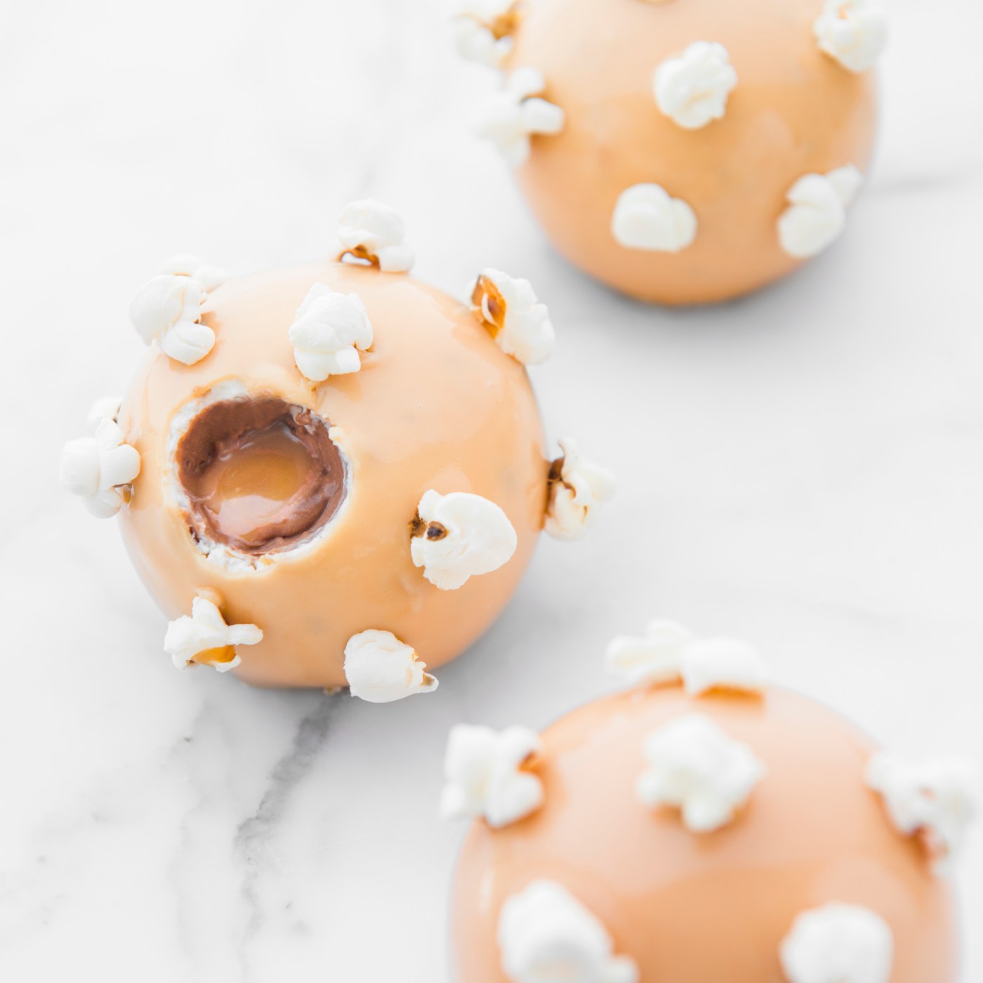 Dressare la ganache nelle cavità dello stampo Dolce Tartufo, aggiungere gli inserti di cremoso congelati, chiudere con i dischetti di sablé tagliati a misura e mettere in freezer a congelare; smodellare le mono porzioni, glassarle con la glassa portata a circa 28° C, lasciare scongelare in frigorifero per 3 ore e, prima di servire, decorare con i popcorn.