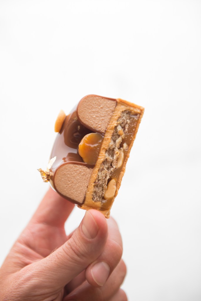Burro, farina 00, zucchero a velo, sale, mandorle, farina di mandorle (opzionale), uova, latte intero, panna fresca, gelatina in fogli*, zucchero semolato, cioccolato fondente 70%, cioccolato al latte, cioccolato bianco, burro di arachidi, arachidi salate, sciroppo di glucosio, foglia oro alimentare (opzionale).